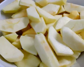 Καθαρίζουμε και κόβουμε τα μήλα μας . Τα περιχύνουμε με τον χυμό λεμονιού και τα ανακατεύουμε να πάει παντού.