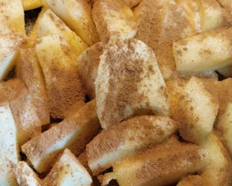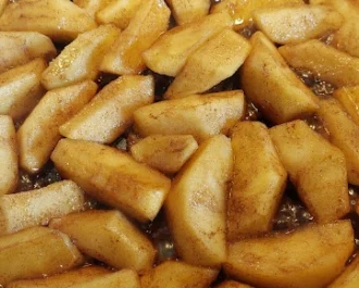 Καθαρίζουμε, κόβουμε, βάζουμε στο τηγάνι τα μήλα, ζάχαρη , κανέλα και βούτυρο.