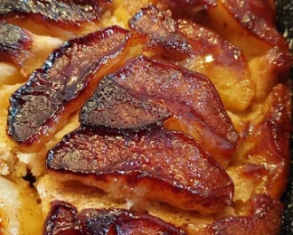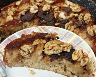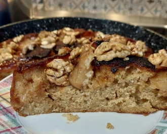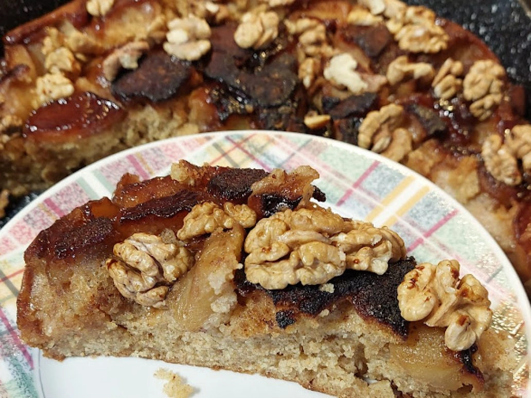 Δυστυχώς ξέχασα να βγάλω φωτογραφία το πως ψήθηκε η ζύμη από πάνω. Δεν παίρνει χρώμα αλλά ψήνεται ολόκληρη και φουσκώνει ελαφρά. Την άφησα 20 λεπτά και είδα ότι έσφιξε καλά και ξεκόλλησε από τα πλάγια του τηγανιού. Με μυτερό μαχαίρι τρύπησα το κέικ και μόλις είδα ότι βγήκε καθαρό έβαλα μία πιατέλα μεγάλη και αναποδογύρισα την μηλόπιτα και την ξαναέβαλα προσεκτικά ξανά στο τηγάνι με την ζύμη από κάτω. Αν δούμε ότι κολλάει αφήνουμε να ψηθεί λίγο ακόμη. Καλό είναι να την ξεκολλήσουμε πρώτα με σπάτουλα από κάτω πριν την γυρίσουμε.