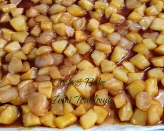 Στρώνουμε το ένα φύλλο σφολιάτας σε βουτυρωμένο ταψί 28 εκ. Τρυπάμε με πιρούνι και απλώνουμε επάνω όλο το μείγμα με τα μήλα.