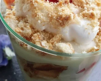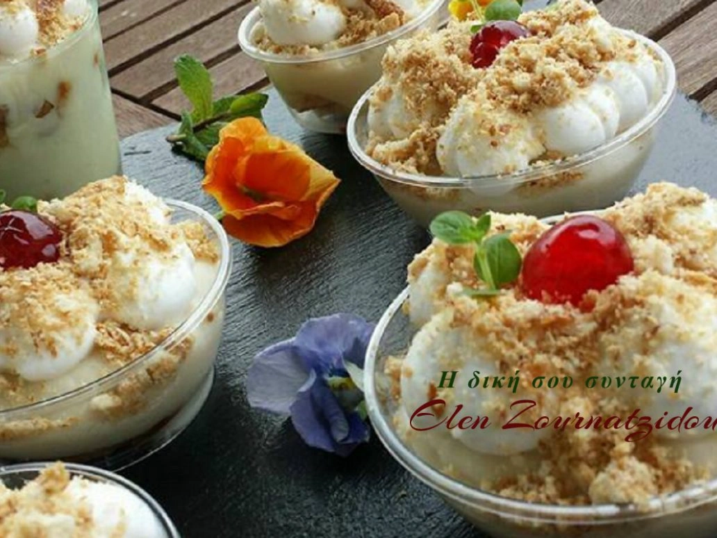 Βάζουμε εναλλάξ σφολιατίνια σπασμένα με κρέμα στα ποτήρια μας.