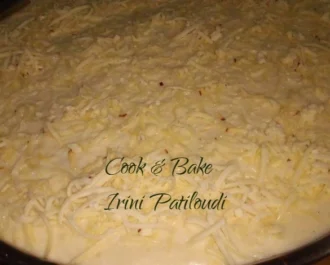 Για την μπεσαμέλ βάζουμε όλα τα υλικά εκτός τα αυγά και ανακατεύουμε συνέχεια μέχρι να κοχλάσει η κρέμα, αποσύρουμε και σπάμε μέσα τα αυγά και ανακατεύουμε γρήγορα. Απλώνουμε πάνω από τον κιμά μας και πασπαλίζουμε με κεφαλοτύρι.