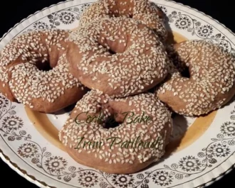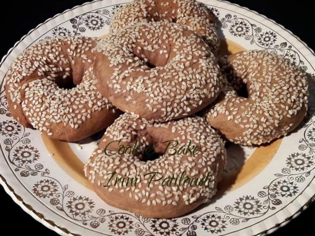 Αφήνουμε 15 λεπτά τη ζύμη να ξεκουραστεί. Παίρνουμε 50 γρ. ζύμη και πλάθουμε στρογγυλά κουλούρια. Στρώνουμε αντικολλητικό χαρτί στο ταψί και τοποθετούμε επάνω τα κουλούρια (αν θέλουμε τα περνάμε στο σουσάμι), τα σκεπάζουμε με ένα άλλο ταψί και ψήνουμε σε προθερμασμένο φούρνο 150 βαθμούς αέρα για 20 λεπτά. Βγαίνουν περίπου 40 κομμάτια.