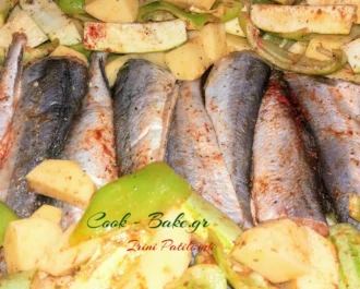 Σκεπάζουμε τα ψάρια με τα λαχανικά για να μην στεγνώσουν στο ψήσιμο, προσθέτουμε 1 ποτήρι νερό και λίγο ελαιόλαδο, το αλάτι και τα μπαχαρικά και ψήνουμε στους 200 βαθμούς για 50 με 55 λεπτά.