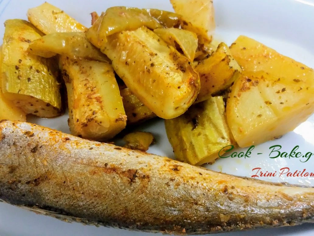 Μπακαλιαράκια με πατάτες και κολοκυθάκια στον φούρνο.