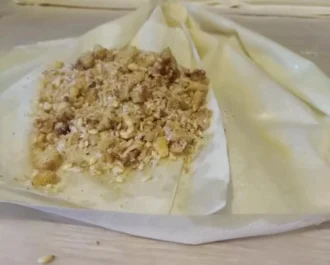 Λιώνω το βούτυρο ανακατεύω καρύδι, σουσάμι, ινδοκάρυδο, μπισκότα, κανέλα και γαρύφαλλο. Με το πινέλο αλείφω το λιωμένο βούτυρο στο φύλλο, το σουρώνω στη μέση σαν βεντάλια το διπλώνω και βάζω 2 κουταλιές της σούπας από την γέμιση.