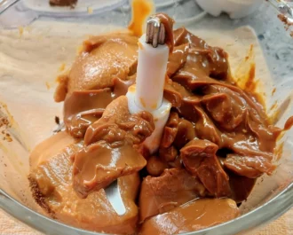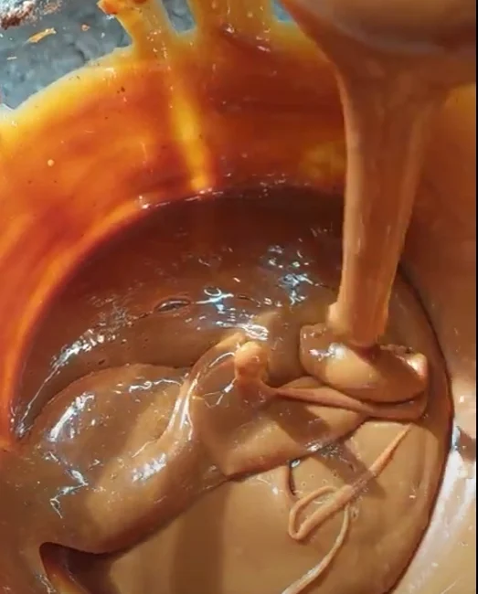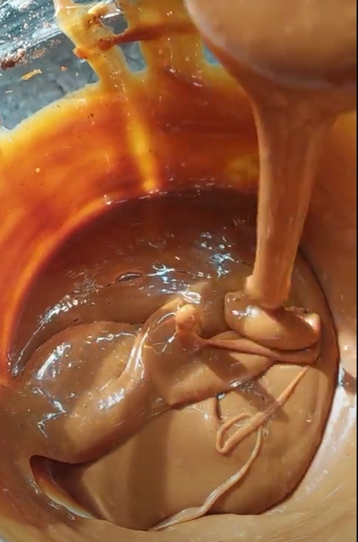 Χτυπάμε την κρέμα γάλακτος σε σαντιγί. Προσθέτουμε και το λίγο ζαχαρούχο που μας περίσσεψε να πάρει λίγη καραμελένια γεύση η σαντιγί.