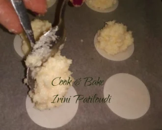 Προσθέτουμε το υπόλοιπο ινδοκάρυδο και αν έχουμε τα ειδικά ρΙζόχαρτα από κατάστημα πρώτων υλών ζαχαροπλαστικής, τοποθετούμε από ένα κουταλάκι γεμάτο από πάνω,
