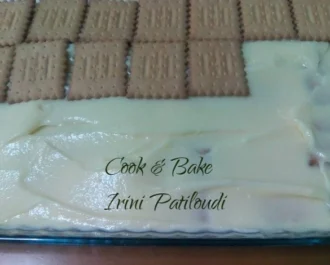 Χτυπάμε την σαντιγί μας με 2 κουταλιές ζάχαρη άχνη και 1 βανίλια και την απλώνουμε επάνω από την δεύτερη στρώση μπισκότα.