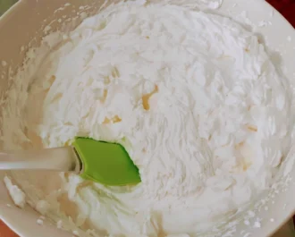 Χτυπάμε τις κρέμες γάλακτος μαζί σε σαντιγί με την άχνη και την βανίλια να σφίξει.