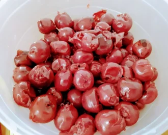 Σουρώνουμε τα βύσσινα και κρατάμε και το ζουμί.