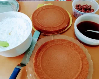 Παίρνουμε τον πρώτο πάτο από το έτοιμο παντεσπάνι και το βάζουμε σε επίπεδη πιατέλα.