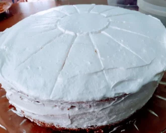 Αφού ραντίσουμε και το τελευταίο παντεσπάνι καπάκι, κρατάμε λίγη σαντιγί, 3 κουταλιές σούπας για το ντεκόρ με το κορνέ. Σκεπάζουμε το παντεσπάνι όλο με σαντιγί και απλώνουμε παντού ομοιόμορφα.