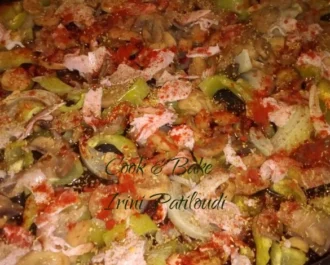 Βγάζουμε από τον φούρνο το ταψί και αφού έχουμε ανακατέψει τα υπόλοιπα υλικά μας τα αδειάζουμε στο ταψί και ψήνουμε στην μεσαία σχάρα για 30 με 35 λεπτά.