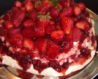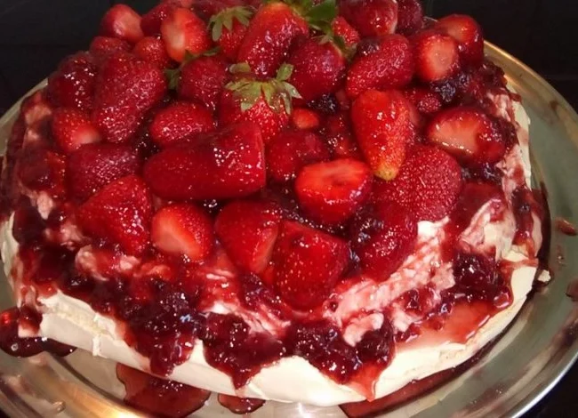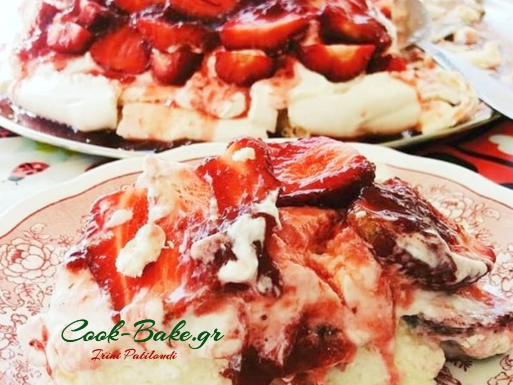 Πάβλοβα, μαρέγκα με σαντιγί, φράουλες και σιρόπι
