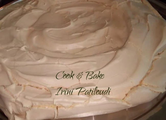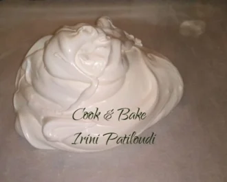 Σε ταψί με αντικολλητικό χαρτί κάνουμε έναν κύκλο με την μαρέγκα στο μέγεθος μιας τούρτας και ένα βαθούλωμα στην μέση.