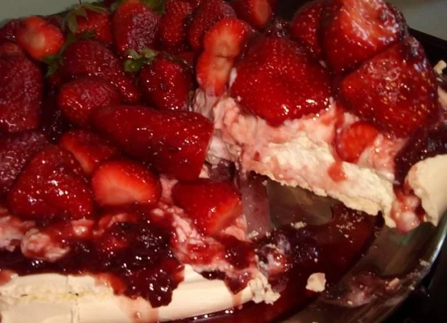 Υπέροχο γλυκό με αφράτη μαρέγκα, σαντιγί , σιρόπι φράουλας και φρέσκες φράουλες..