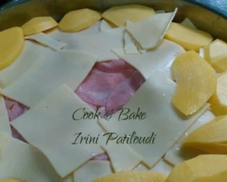 Καθαρίζουμε και κόβουμε τις πατάτες σε ροδέλες όχι πολύ χοντρές ούτε πολύ λεπτές. Στρώνουμε τις μισές κάτω, από πάνω βάζουμε το αλλαντικό μας σε φέτες στην σειρά και από πάνω το τυρί μας σε φέτες. Σκεπάζουμε με τις υπόλοιπες πατάτες , αν δεν μας φτάσουν, συμπληρώνουμε για να σκεπάσουν από πάνω.