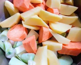Σε κατσαρόλα κόβουμε σε μεγάλα κομμάτια τα λαχανικά μας. Προσθέτουμε τα υλικά για τον πουρέ και βράζουμε για 45 λεπτά.