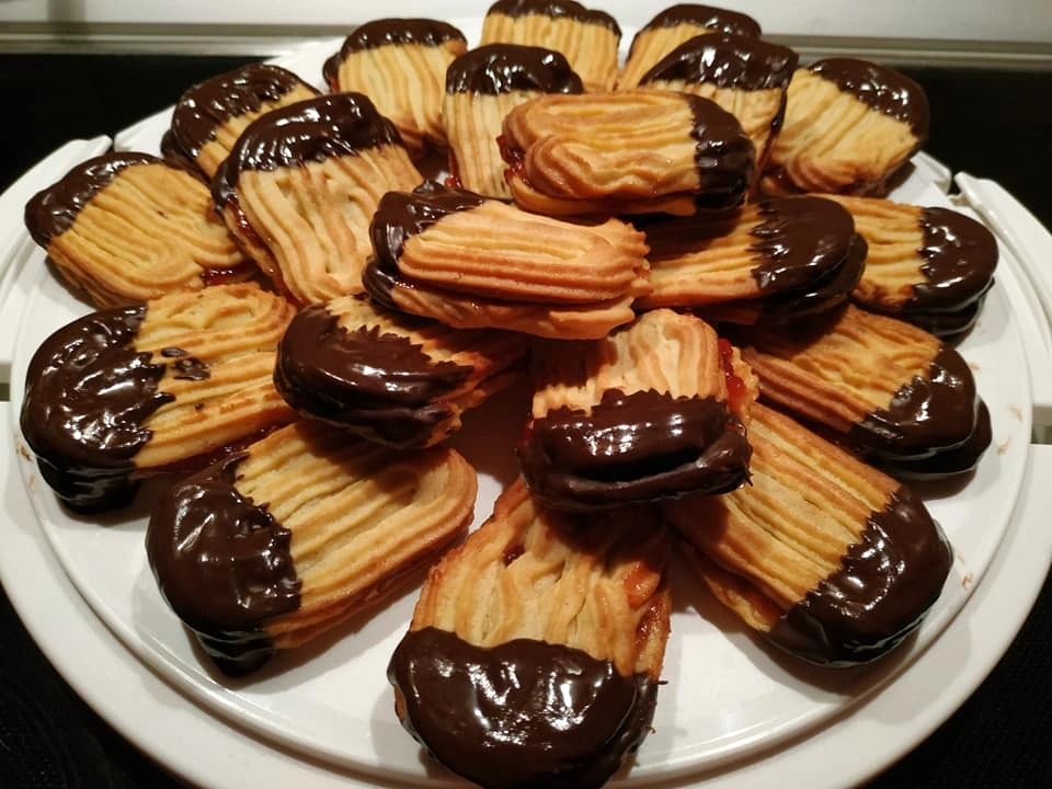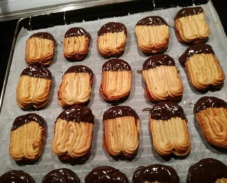 Αφού κρυώσουν βάζουμε σε ένα μπισκότο μαρμελάδα αρεσκείας μας και το καπακώνουμε με άλλο μπισκότο. Βουτάμε σε 300γρ λιωμένη κουβερτούρα με 2 κουταλιές ηλιέλαιο την μία άκρη τους και τοποθετούμε σε λαδόκολλα μέχρι να στεγνώσουν. Καλή απόλαυση!