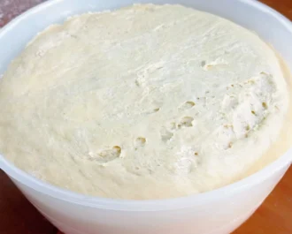 Χτυπάμε όλα τα υλικά της ζύμης στο μίξερ ή ζυμώνουμε στο χέρι. Να γίνει μία ελαστική μέτρια ζύμη που να μην κολλάει.