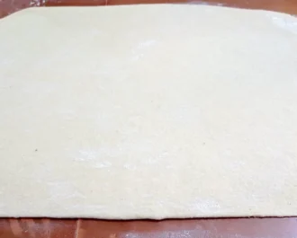 Αφού διπλασιαστεί το ζυμάρι μας το ζυμώνουμε λίγο και σε αλευρωμένο πάγκο το ανοίγουμε με τον πλάστη.