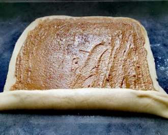 Τυλίγουμε σε ρολό και κόβουμε σε ρολάκια πάχους 2 δάχτυλα και τα τοποθετούμε σε ταψί με λαδόκολλα. Αραιώνουμε με λίγο γάλα τις δύο κουταλιές της γέμισης που έμειναν και ρίχνουμε πάνω από τα ρολάκια, κάνει ωραία κρούστα στον φούρνο.