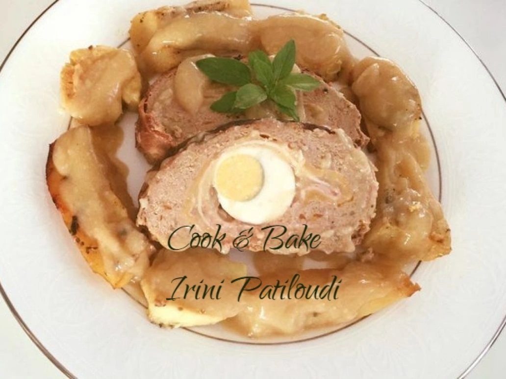 Ρολό κιμά με αυγό, μπέικον, τυρί, πατάτες και γλυκοπατάτες με σάλτσα γκρέιβι.