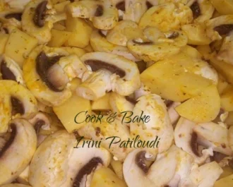 Ετοιμάζουμε τις πατάτες και τα μανιτάρια σε άλλο ταψί, μπορούμε να ψήσουμε και το ρολό μαζί αν θέλουμε, εδώ τα βάλαμε χώρια. Βάζουμε τα μπαχαρικά μας , κύβο, μουστάρδα,1 ποτήρι νερό, λάδι και ψήνουμε για 1 ώρα στους 200 βαθμούς να πάρουν ωραίο χρώμα.