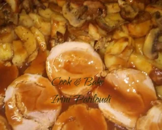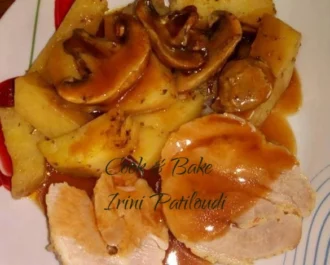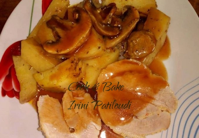 Ρολό χοιρινό με πατάτες και μανιτάρια.