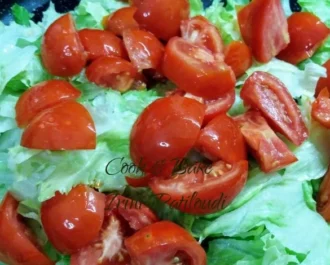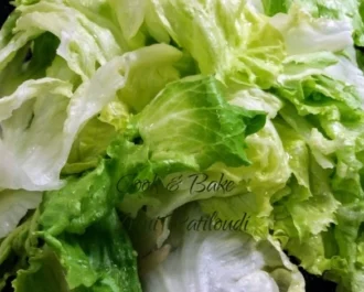 Πλένουμε και στραγγίζουμε την σαλάτα μας και την κόβουμε με το χέρι σε κομματάκια.