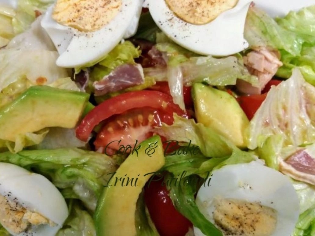 Δροσερή και βιταμινούxα σαλάτα με iceberg, avocado, prosciutto, αυγά.
