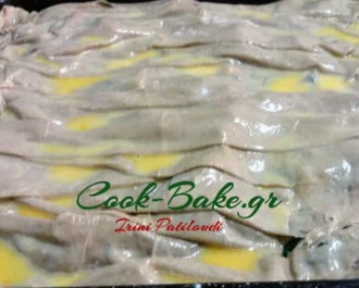 Σκεπάζουμε με τα άλλα 3 φύλλα και αυτά σουρωμένα και ελαφρά λαδωμένα.