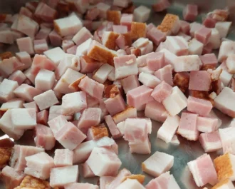 Κόβουμε σε μικρούς κύβους το μπέικον .