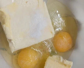 Χτυπάμε με το μίξερ χειρός το βούτυρο με τα αυγά και το αλάτι.