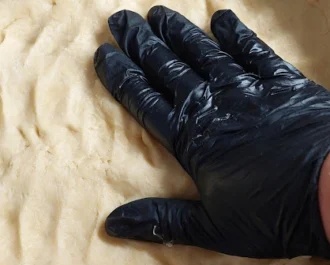 Στρώνουμε με το χέρι την ζύμη στην φόρμα ή το ανοίγουμε με πλάστη αν έσφιξε πολύ.