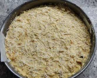 αδειάζουμε στην φόρμα την γέμιση και πασπαλίζουμε με το κεφαλοτύρι.