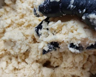 Με το χέρι ζυμώνουμε την ζύμη θέλουμε να είναι με γρομπαλάκια και όχι λεία.