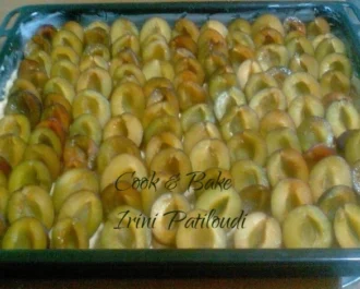 Απλώνουμε την τριφτή ζύμη επάνω από τα δαμάσκηνα και ψήνουμε στους 180 βαθμούς αέρα για 50 με 60 λεπτά. Σηκώστε με ένα πιρούνι την άκρη της ζύμης να δείτε αν ψήθηκε από κάτω.
