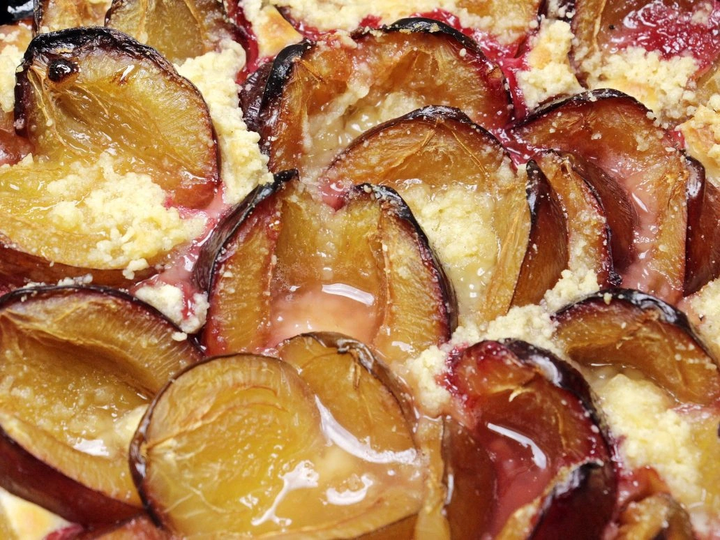 Τάρτα με δαμάσκηνα παραδοσιακή γερμανική με κραμπλ από πάνω.