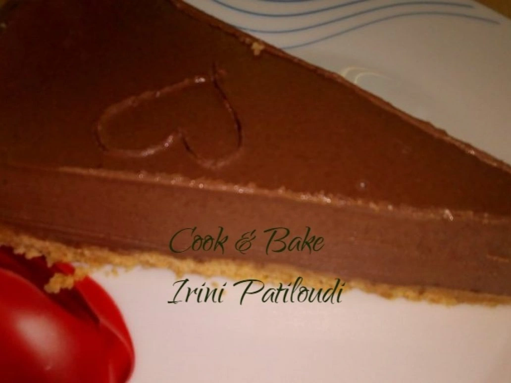 Αδειάζουμε την κρέμα σοκολάτας πάνω στη βάση της τάρτας και την στρώνουμε ομοιόμορφα.