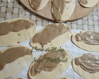 Ζυμώνουμε τα υλικά της ζύμης μας και αφήνουμε την ζύμη να ξεκουραστεί μισή ώρα. Χτυπάμε στο μίξερ τα υλικά της γέμισης. Χωρίζουμε την ζύμη σε 16 κομμάτια. Ανοίγουμε φύλλα μακρόστενα και βάζουμε από μία κουταλιά σούπας γέμιση.