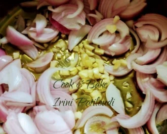 Κόβουμε σε φέτες τα κρεμμύδια μας , ψιλοκόβουμε το σκόρδο και τα τσιγαρίζουμε στο ελαιόλαδο μας να πάρουν λίγο χρώμα και να μαραθούν.