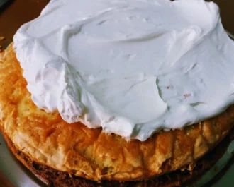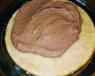 Σκεπάζουμε με την σκέτη σαντιγί το τελευταίο παντεσπάνι, στρώνουμε ομοιόμορφα και βάζουμε στο ψυγείο.