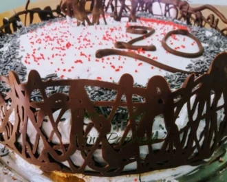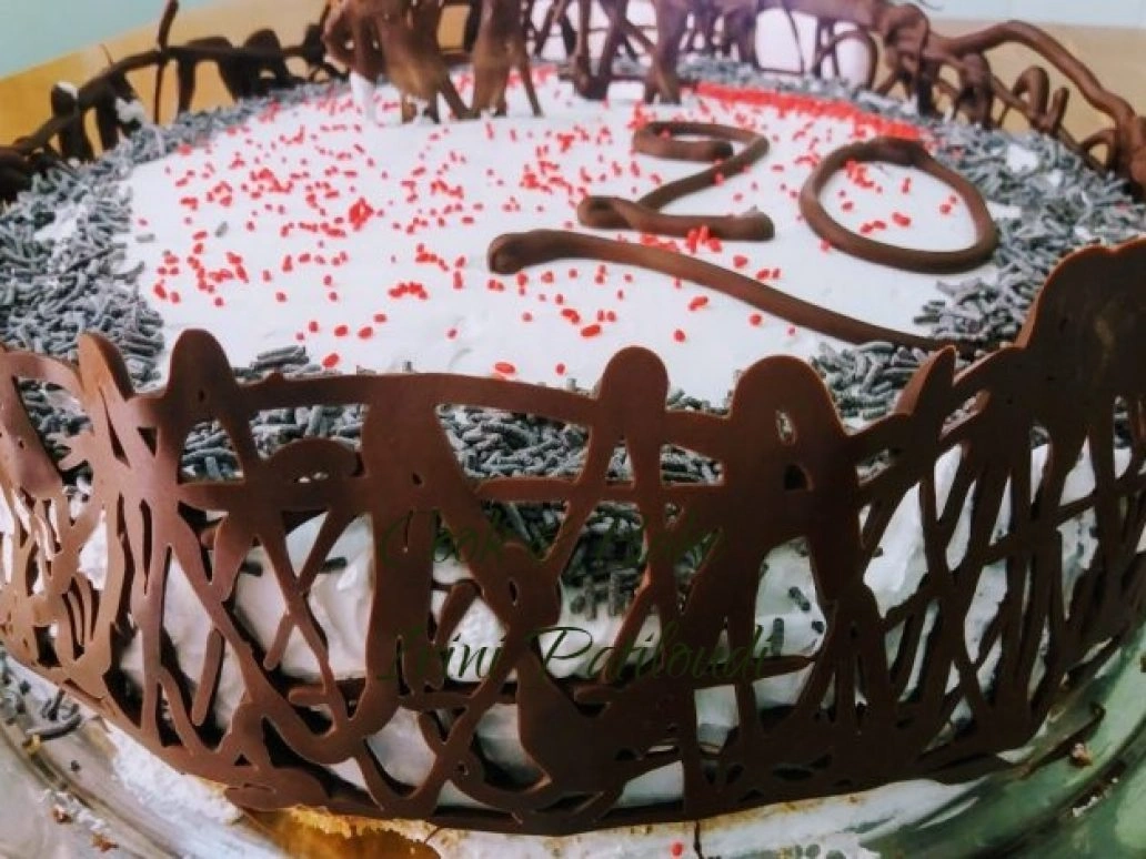 Κόβουμε χαρτί ψησίματος σε λωρίδα όσο είναι η περίμετρος της τούρτας μας και βάζουμε σε σακούλα κορνέ, μιας χρήσης καλύτερα την λιωμένη σοκολάτα, να μην είναι πολύ ζεστή περίπου 28 με 29 βαθμούς. Κάνουμε επάνω ότι αφηρημένα σχέδια θέλουμε και αφήνουμε να παγώσει η σοκολάτα επάνω στο χαρτί ένα βήμα πριν γίνει κόκκαλο.