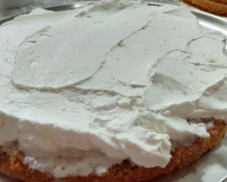 Αφού στρώσαμε κάθε φύλλο σκεπάζουμε με την σαντιγί καλά τα τοιχώματα και την επιφάνια της τούρτας.