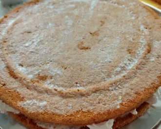 Βάζουμε την μία φέτα παντεσπάνι σε πιατέλα ή βάση τούρτας.