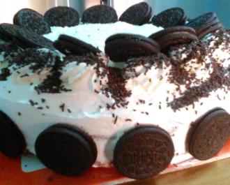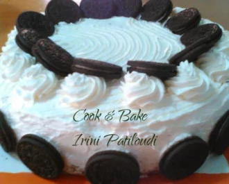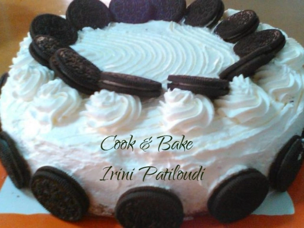 Με δικό μας παντεσπάνι, κρέμα σοκολάτα, σαντιγί, μπισκότα ορέο.