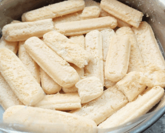 Βουτάμε γρήγορα στο γάλα με λικέρ τα σαβαγιάρ ένα ένα και αραδιάζουμε σε 26άρα στρόγγυλη φόρμα.