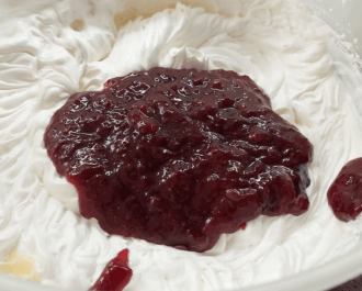 Προσθέτουμε στην κρέμα τα 3/4 της μαρμελάδας και χτυπάμε να ανακατευτεί καλά και να σφίξει η σαντιγί.